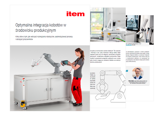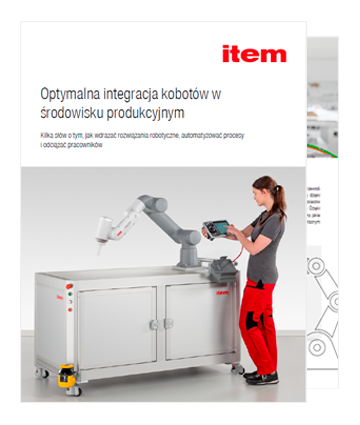 Integracja robota za pomocą systemu modułowego item: W oparciu o używane na całym świecie wyroby aluminiowe item można wykonać takie elementy wchodzące w skład peryferii robota, które są potrzebne dla danego rozwiązania. Możliwe są np. stoły robocze do współpracy człowiek-robot z możliwością rozbudowy, zamknięte stacje robotyczne, niezajmujące dużo miejsca kolumny do robotów współpracujących i dużo więcej. Skorzystaj z naszych standardowych rozwiązań, zmodyfikuj je według własnych potrzeb lub zaprojektuj własne rozwiązanie – do wyboru masz ponad 4 500 komponentów, które można dowolnie ze sobą łączyć.